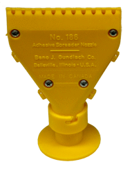 For use on 4" cove base, this economically priced nozzle dispenses 11 beads (thick or thin) of adhesive in a 2-3/4" spread. The nozzle and neck lock together to prevent accidental separation. Tongue and groove edge construction and internal dams prevent side leakage Removable screws allow nozzle to be opened for cleaning. Two-piece yellow plastic construction.
