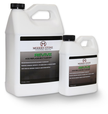 Modern Stones Revive is an acid replacement technology cleaner designed to etch grout, remove grout and mortar smears, mineral deposits and rust stains. This concentrated, salts-based cleaner is specially formulated to be highly effective with additional handling and safety benefits when compared to traditional acid-based cleaners. Revives breakthrough formulation is highly resistant against damaging stainless steel, chrome or brass.Use on acid-resistant tile, stone or masonry surfaces. A pre-test for resistance should be performed prior to use. Test in an inconspicuous area to determine ease of application and desired results.