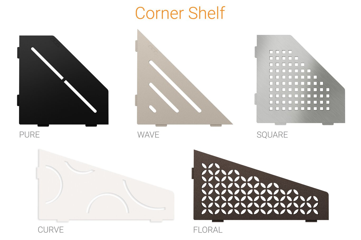 Schluter-SHELF-E is a wall storage system. The shelves are 5/32″ (4 mm) -thick and feature designs coordinating with the Curve and Floral styles found in KERDI-DRAIN and KERDI-LINE drain grates. They can be used in showers and other tiled wall applications (e.g., kitchens and baths). SHELF-E is suitable for corner installations and available in three different shapes. It features 3/32″ (2 mm) -thick tabs that allow for installation with the tile or in retrofit applications.