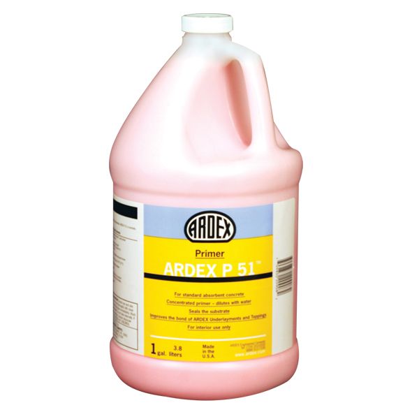 A solvent-free primer for the installation of ARDEX underlayments and toppings over absorbent concrete. *For specialized applications and with select underlayments, ARDEX P 51 also can be used for priming wood, gypsum and non-water soluble adhesive residue over concrete. Non-porous substrates, burnished concrete, non-absorbent terrazzo, quarry and ceramic tile and epoxy coatings must be primed with ARDEX P 82® Ultra Prime.